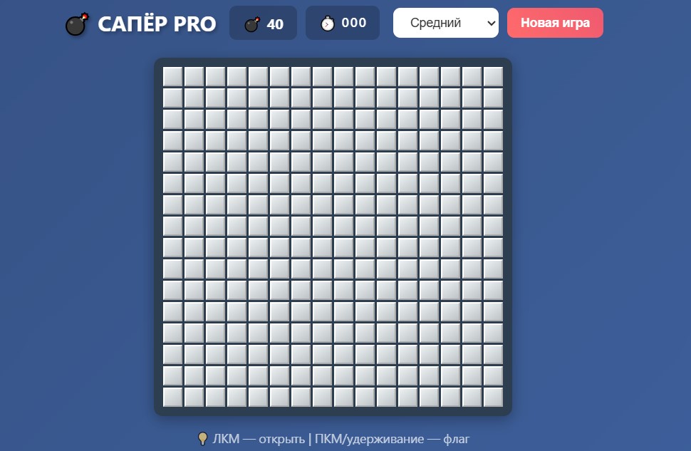 Игровое поле представляет собой сетку (например, 9×9, 16×16 или больше),